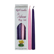 7/8 inch in diameter and 10 inches tall with tapered base. This set of 3 purple and 1 rose candles fits many home wreaths.