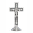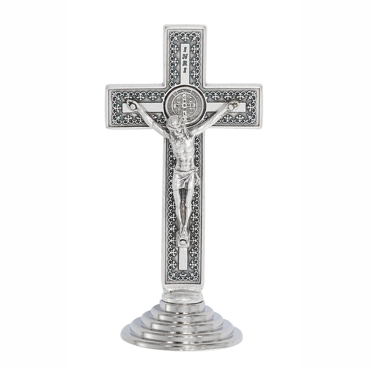 This handsome standing crucifix features a silver finish body of Christ and double sided Saint Benedict Jubilee medal mounted on a silver and black metal cross.