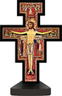 Beautiful glossy wooden image of the San Damiano crucifix 6in long on pedestal. This crucifix nicely design makes a wonderful gift for family, friends or church members, or for buyers that only want the best quality to add to their collection!