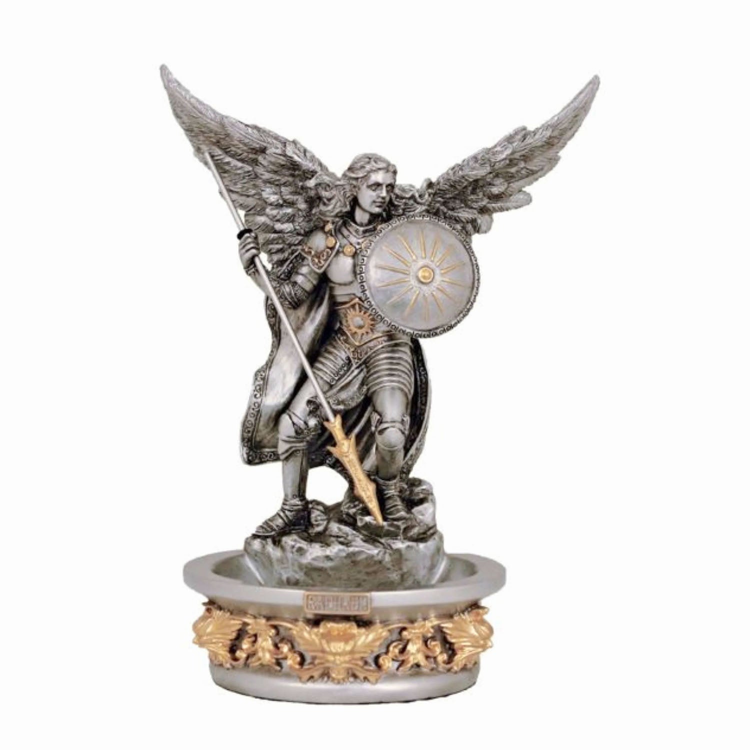 Saint Raphael the Archangel holy water font, in pewter finish with gold highlights.
