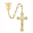 7MM GOLD PLATED PEWTER & PEARL ROSARY WITH HOLY MASS EPOXY CRUCIFIX & MIRACULOUS CENTER.