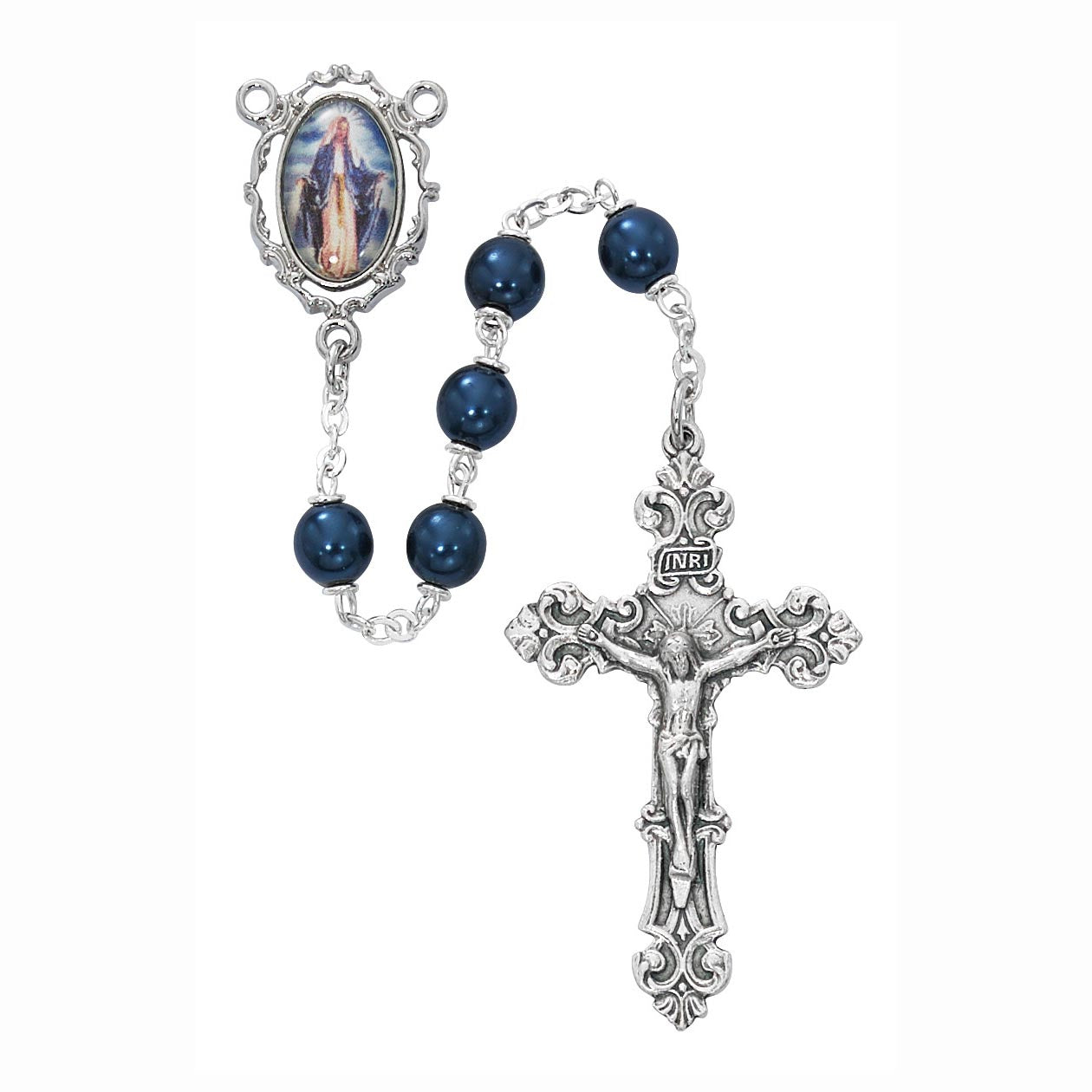 7MM BLUE PEARL GLASS BEAD WITH RHODIUM PLATED PEWTER CRUCIFIX AND CENTER.