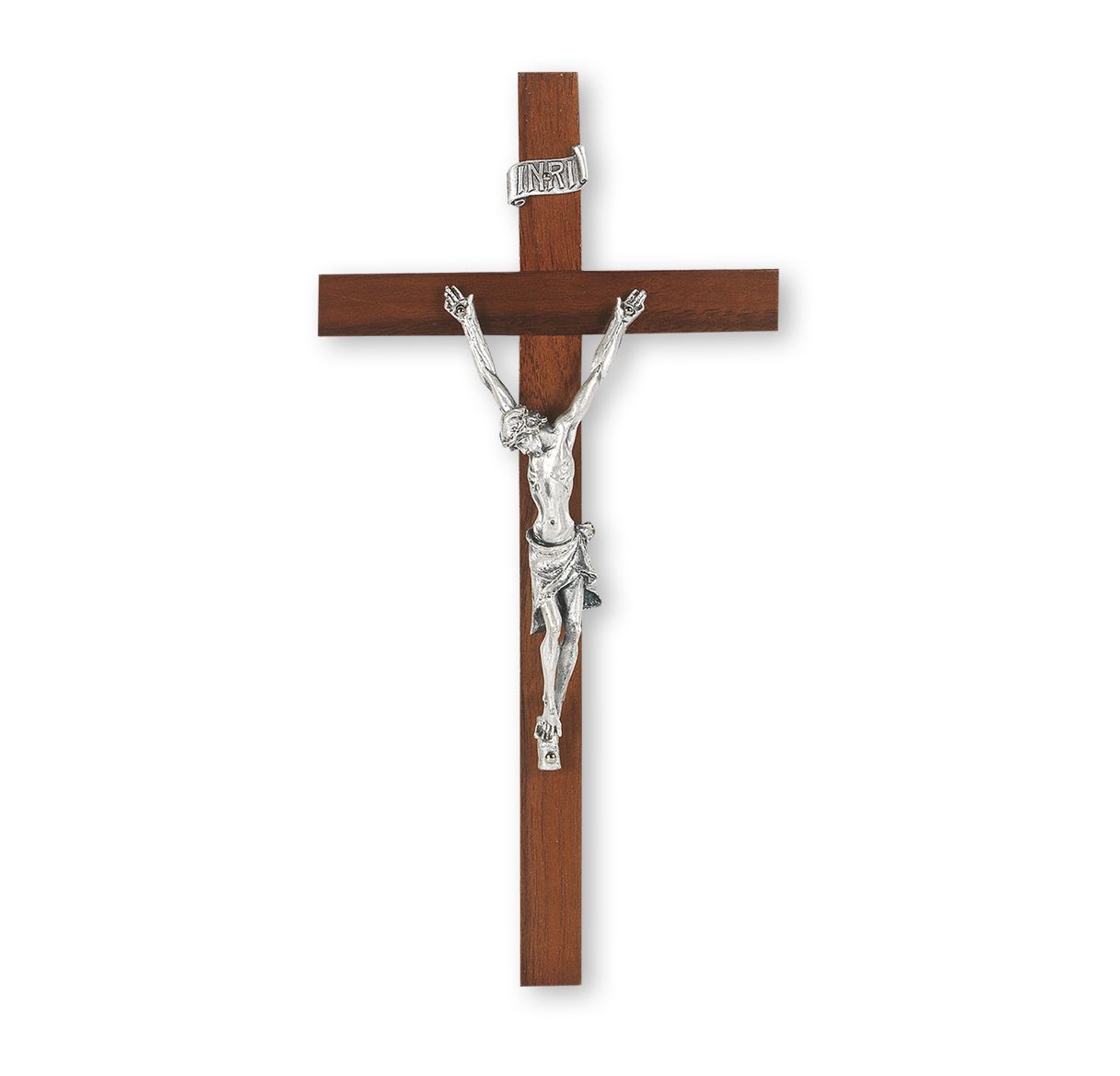 Solid hardwood the 9 inch tall, cross has walnut finish. The deluxe Slim 9" Genuine Walnut Wood Cross displays the superb antique silver finish Cipolletti corpus, made in Italy by some of the finest Italian craftsmen.