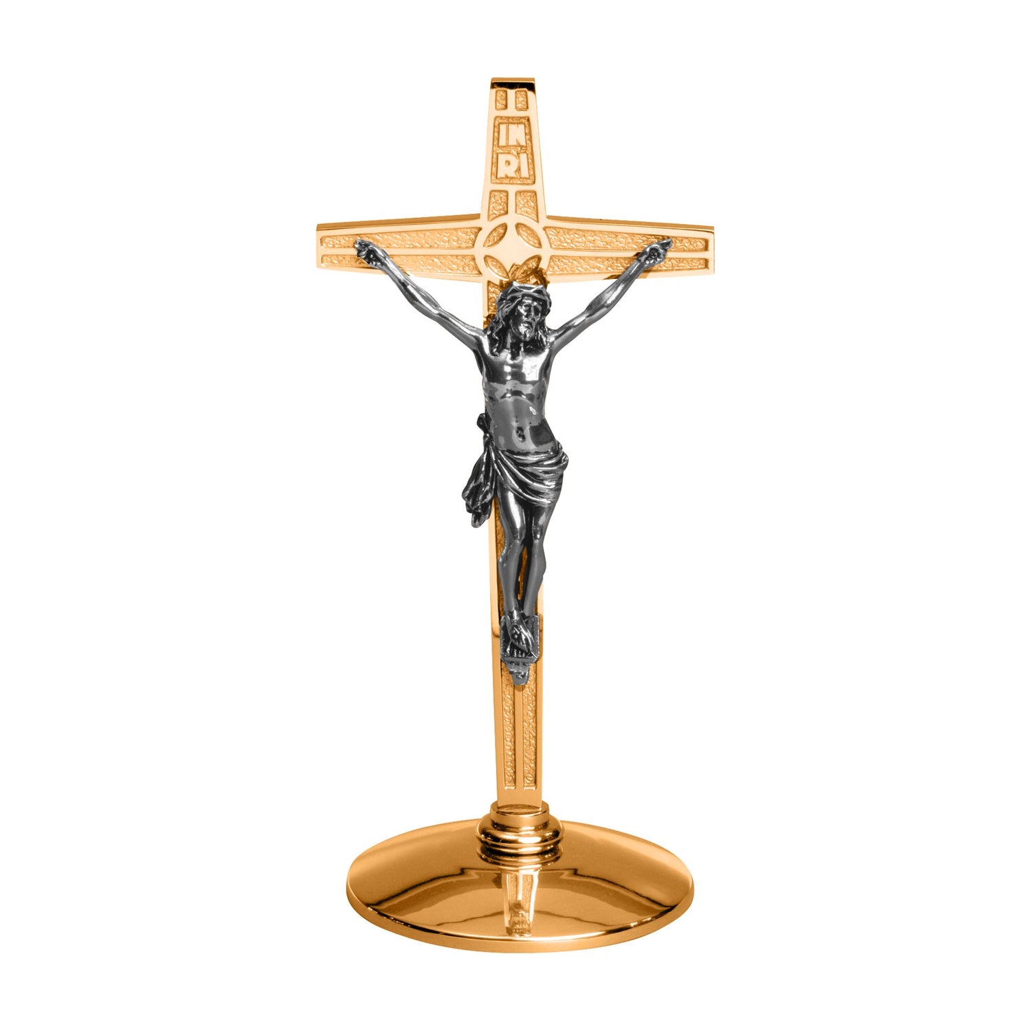 This standing altar crucifix is shown in a High Polish finish on a bronze appointment. Also available in Satin finish or in High Polish Brass or Satin finish Brass.