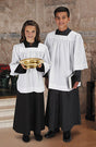 45%Cotton/65&Poly Altar server surplices with square necklines and 3/4 length sleeves.