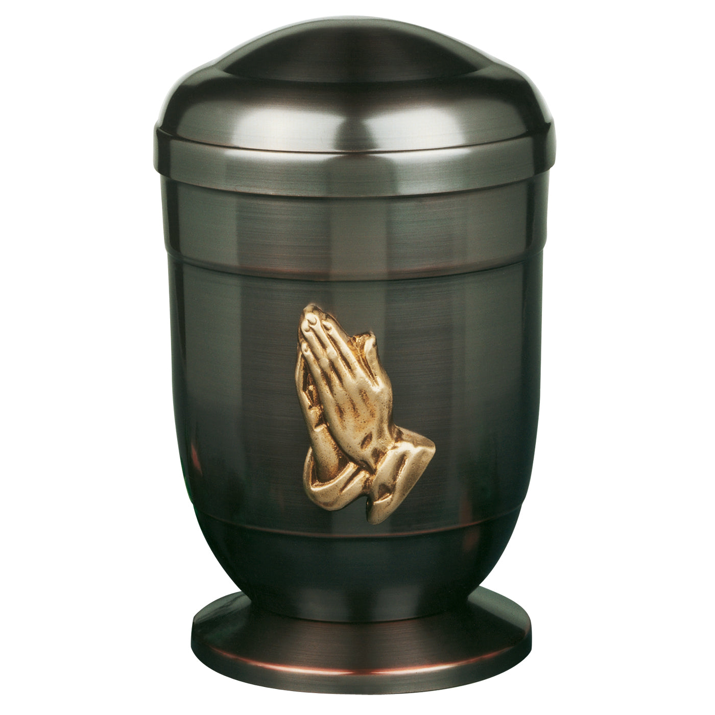 Black Finish Copper Memorial Urn with Brass Hands in Prayer. Minimum capacity 200 cubic inches.
