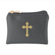 Black Leatherette Textured Zipper Rosary Pouch with anti-tarnish lining and gold cross.