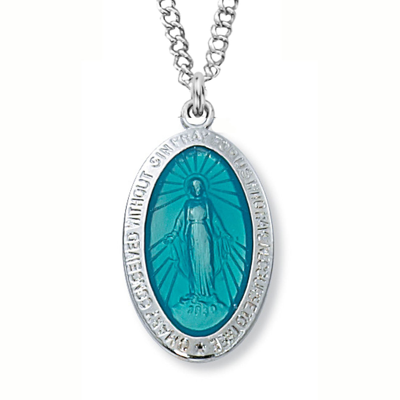Beautiful, 3/4 inch long Miracoulous medal of Our Lady is cast in fine Sterling silver. The image of Mary is enameled in blue.