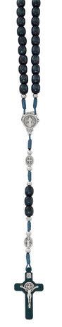 8x10mm Deep Blue wood beads are strung and knotted onto blue paracord. The Our Father beads are small St Benedict medals