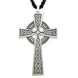 A handsome, 2 inch antiqued silver plated bronze cross comes on on a 33 inch black cord.