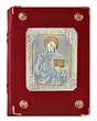 This cover features silver and gold plated panels of Christ the Teacher on the front and the Four Evangelists on the back. Accented with brass plated rosettes.