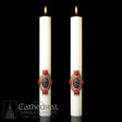 This set of 2 candles are decorated with high quality, richly colored sculpted wax reliefs. These attractive altar candles enhance the presence of the Paschal candle or add to the beauty of your sanctuary for any liturgy.