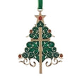 Cast in pewter with a satin hanger, it is beautifully colored in green enamel with gold-finish cross, filigree design and red crystals.