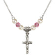 This 1/2 inch long crucifix charm is combined with 4mm creamy, faux pearl glass Beads and rose colored Austrian crystals.