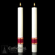 This set of 2 candles are decorated with high quality, richly colored sculpted wax reliefs. These attractive altar candles enhance the presence of the Paschal candle or add to the beauty of your sanctuary for any liturgy.