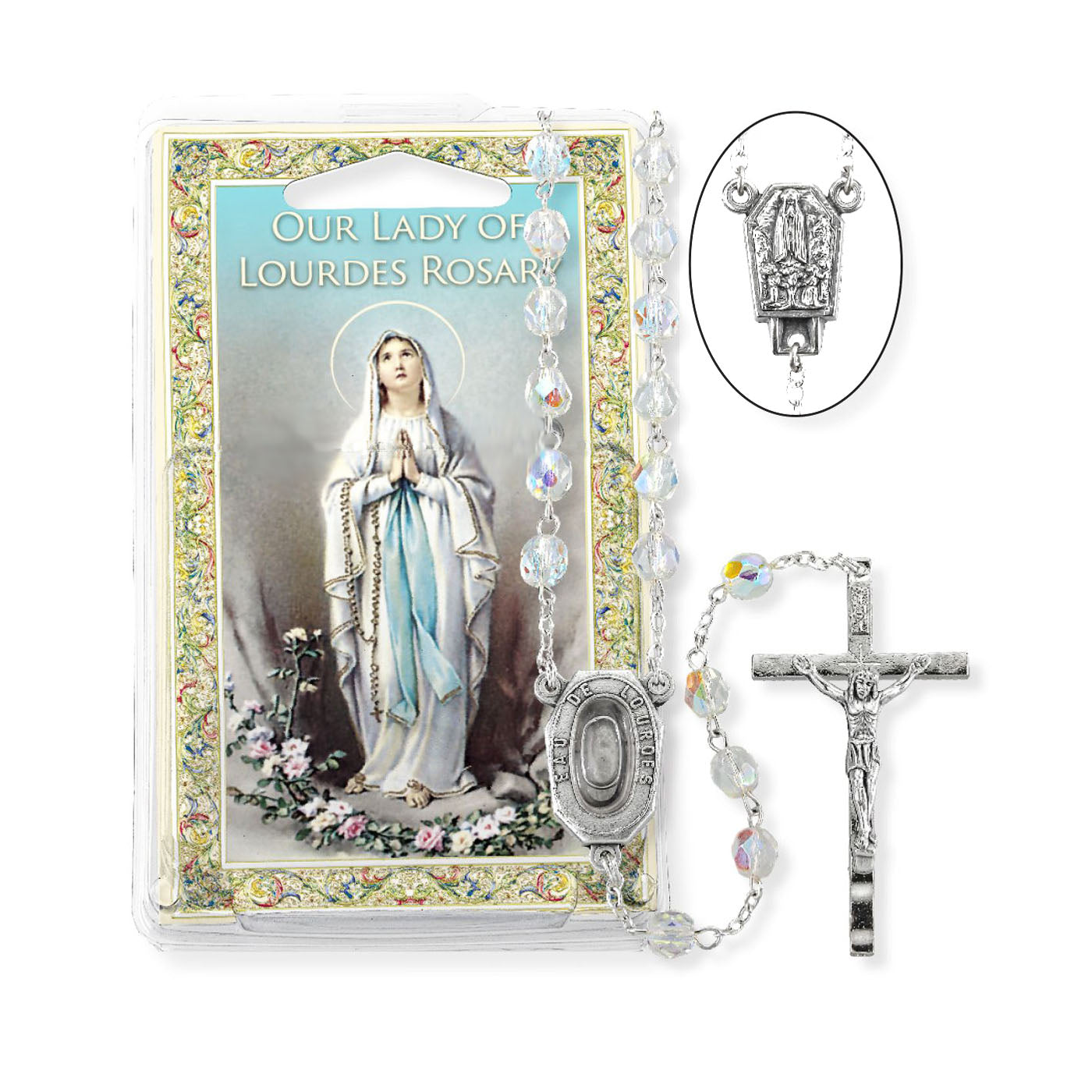Our 'Our Lady of Lourdes' Specialty Rosary comes with 6 mm crystal beads, 'Our Lady of Lourdes' water centerpiece, and crucifix.