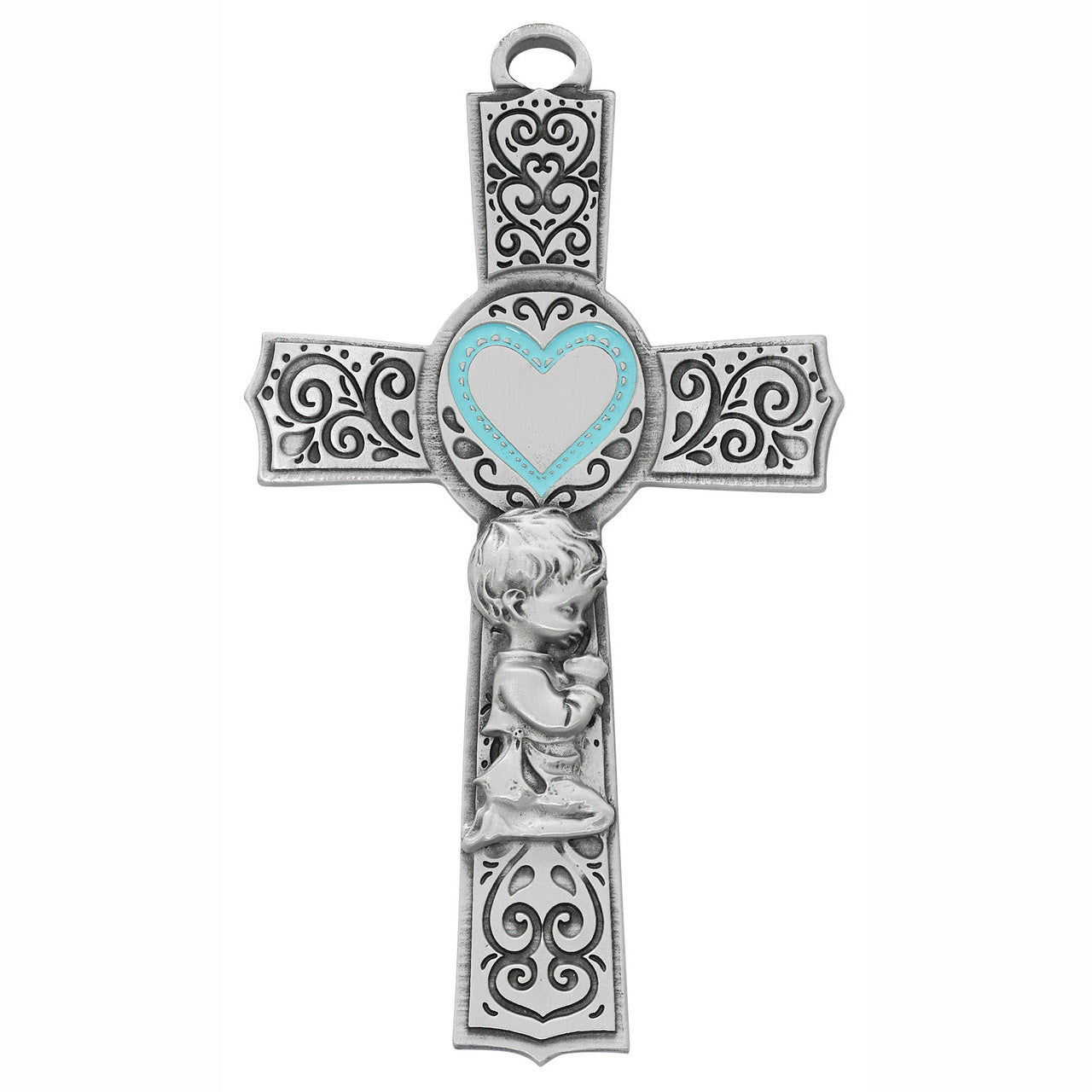 For the family welcoming their baby boy into the world these pewter wall crosses make a meaningful gift for showers or Baptism day.The baby boy pewter wall cross measures 6 inches in length with an elegant scrolling filigree design, blue epoxy heart center and a charmimg little boy in prayer.