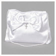 5 inch wide purse is made of white polyester, bridal satin with tiny cross, satin bow and faux 'pearl' shoulder strap.