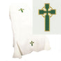 Swiss Schiffli Celtic Cross embroidery in Gold and Green threads.