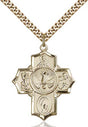 Gold-filled 4-Way cross contains the Scapular medal, the Miraculous medal, St. Joseph, and St. Christopher around the Holy Spirit dove in the center.