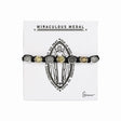 7 inch long slider religious bracelet features small gold and siler finish Miraculous medals on a black cord.