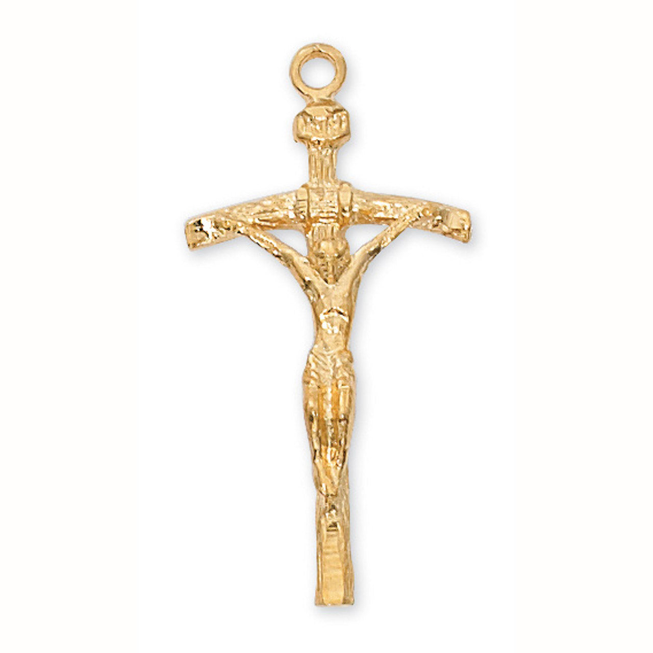 This gold plated sterling silver Papal crucifix, that has been used by Pope's Paul VI, John Paul I, and St. John Paul II. It depicts Jesus just as he is dying, and giving us the gift of salvation. The bent wood symbolises the weight of the sins, that only Jesus could bare.