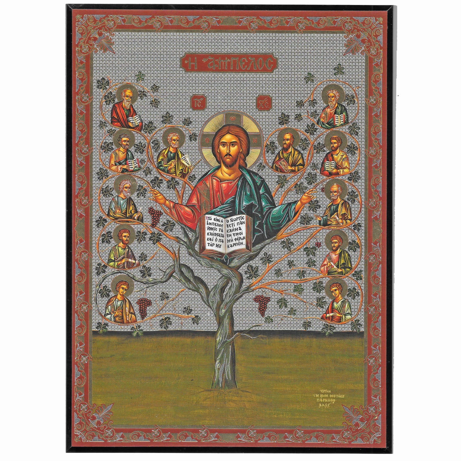 The "Vine" depicts Jesus sitting at the top of a many-branched grape vine and the Twelve Apostles sitting around him on each of the twelve branches. The name of this depiction originates from John 15:5 and in fact that is the text generally shown in the open Gospels held by Jesus in examples of this type: "I am the vine, you the branches: He that abides in me, and I in him, the same bears much fruit: for without me you can do nothing". This Orthodox icon first appeared during the 15th century. Christ sits enthroned at the bifurcation point of the vine’s branches. He has an open Gospel on His knees and His arms are raised in benediction with both hands."
