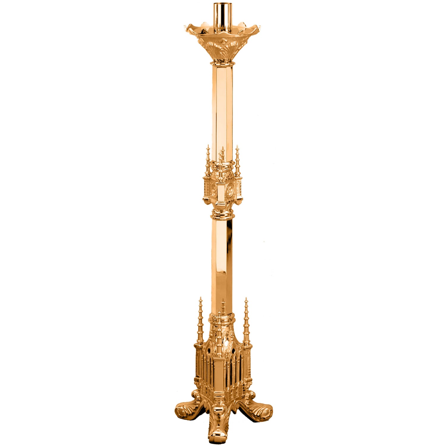 from Excelsis BronzeSweeping spires, peaked arches, triangular shaped bases and ornate castings are all elements of these handsome Gothic sanctuary appointments. Additional complementing pieces to this series feature curved triangular bases with a roped edge.