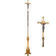 Carry this Gothic inspired base processional Crucifix at the entrance and end of the Mass. The Crucifix features a zinc Corpus with a high polish finish and an ornately embellished stand. The Crucifix height is ninety inches and the footed base measures twelve inches in diameter. Order this Crucifix in a high polish bronze or brass that has been oven-baked for long-lasting durability.