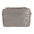 Elegant gray Bible cover is genuine leather sewn together in an attractive patchwork pattern. The leather pieces vary slightly in texture, but they're all buttery soft. Silver metal cross accents front corner.