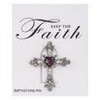 February birthstone cross lapel pin comes carded on a "Keep the Faith" card.