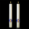 This set of 2 candles are decorated with high quality, gold decals and richly colored sculpted wax reliefs. These attractive altar candles enhance the presence of the Paschal candle or add to the beauty of your sanctuary for any liturgy.