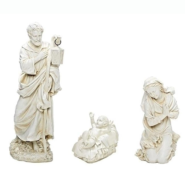 Three piece Holy Family Garden Set has incredible detail and the look of the best religious statuary at a great price.Elegant creamy white finish statues are cast in a resin and stone mix.