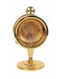Engraved "IHS" design on the front glass. This 7-1/2 inch tall chapel monstrance is plated in 24kt gold.