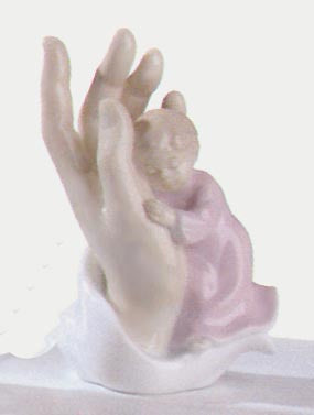 A young girl rests secure in the palm of God's hand. This beautiful figurine makes an great Baptism gift or special gift for a young child. The figurine was inspired by Isaiah 49:15-16 ("See, upon the palms of my hands I have written your name; your walls are ever before me."), and is finished in soft colors with a high polished glaze.