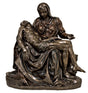 This stunning 31 inch high Pieta statue is cast in resin and stone composition, coated in bronze and then lightly hand-painted.