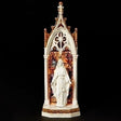 The figure stands on a gold trim base with stained glass look back in a Gothic arch.