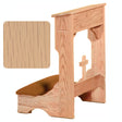 32 inch height, 21 inches deep and 22 inches wide with shelf and wood cross decoration on the lower crosspiece. The sides of the kneeler are carved with a cross.