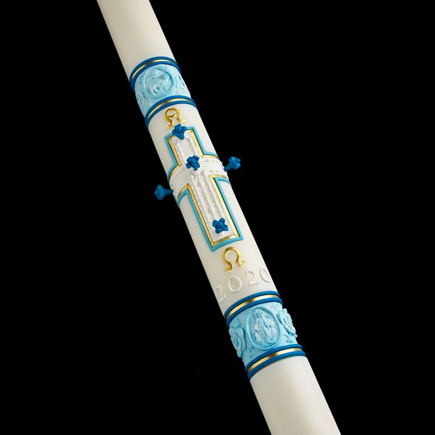Brilliant Marial blue and rich gold leaf elements highlight the candle's Rosary-adorned cross. The Agnus Dei of the top band crowns the candle, while the Miraculous Medal graced with roses and fleurs-de-lis anchors the bottom band.