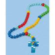 15mm large wood bead rosary in bright multi colors with a blue Mary and Jesus cross.