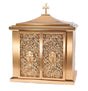 The tabernacle measures 25 inches high, 21.5 inches wide and is 15.5 inches deep. The Independent action doors measure 14.25H x 13.5W inches in size and come equipped with vault locks. It is topped with a gently sloping roof-style dome with cross finial.