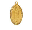 1-1/16 inches long oval shaped, sterling silver medal plated in 18kt gold, with an image of Our Blessed Mother. Comes on a 18 inch curb chain with spring clasp that is gold plated.