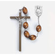 18x25mm oval wood beads stained in walnut finish on durable oxidized link chain. Silver Oxidized corpus on 7 inch Crucifix , Sacred Heart of Jesus center.