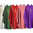 These chasubles are made in 5 liturgical colors by Solivari, Sri, in Italy in Linea fabric. Linea is woven of 95% pure, lightweight and breathable wool and 5% gold and silk threads, and makes a beautiful and comfortable choice, (especially in warmer climates!)
