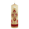 Hand-decorated with metallic wax relief with the red and gold cross, Alpha Omega symbols, and white Agnus Dei lamb.