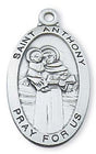 1-2/16 inches in length oval shaped, sterling silver medal, with an image of St. Anthony of Padua, Doctor of the Church, Wonder Worker, and Hammer of the Heretics. Parton of married couples, children, animals, and miners. Frequently invoked as the finder of lost objects.
