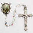 Made with clear, faceted crystal beads with and aurora borealis finish that measure 6mm in size. The deluxe crucifix is cast in fine pewter. Made in the USA