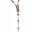 Two different color wood beads with tough brown cord has a silver finish oxidized metal rosary center and crucifix.