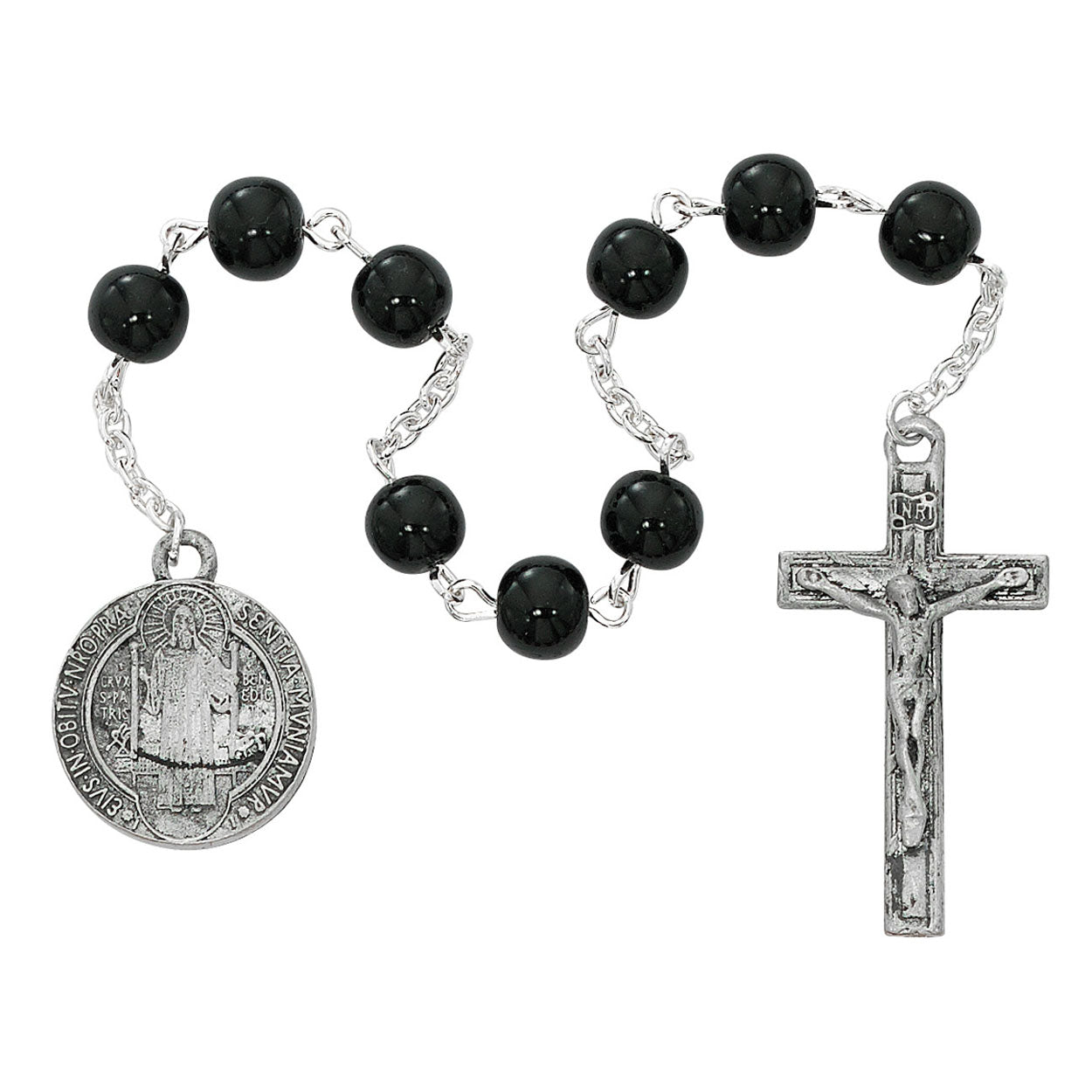 Black crystal beads with St. Benedict medal. This special chaplet has 9 beads and also includes a card on how to pray the chaplet.
