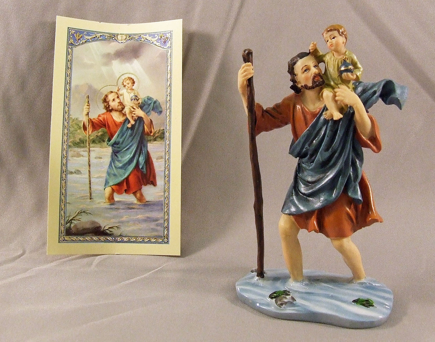 Saint Christopher, "Christ-bearer", is the patron saint of America, motor travelers, travelers and one of the 14 Holy Helpers of St. Joan of Arc. He is invoked against accidents, sudden death, and all mortal danger. Feast day is July 25th.